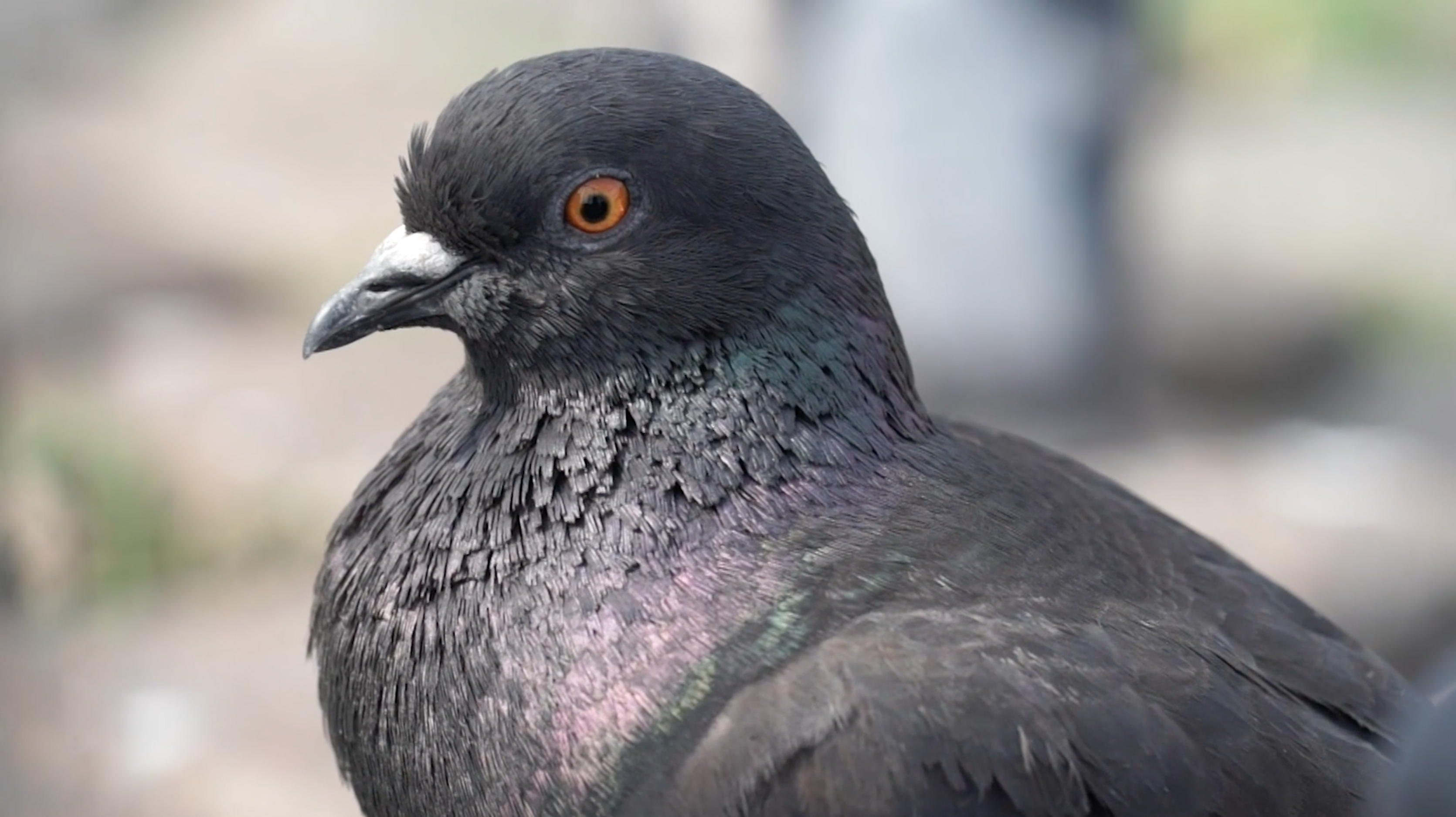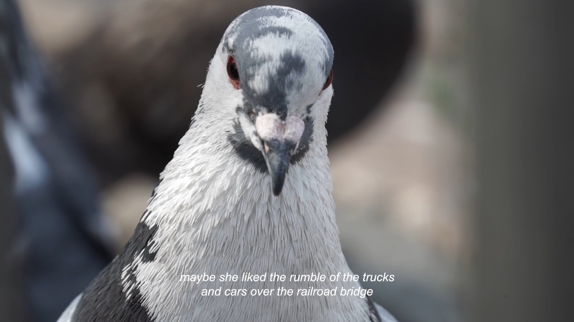 Queen of the Hill is a video exploring rock pigeons in Berlin. Filmed close-up, the pigeons appear large, and their feathers and colors shine in detail. The work combines observation, real-time voice-over, and poetic reflections inspired by thinkers such as Bruno Latour and Donna Haraway, exploring the well-being of urban birds. It reflects on interspecies relationships and everyday coexistence, presenting each pigeon as a queen in its territory.