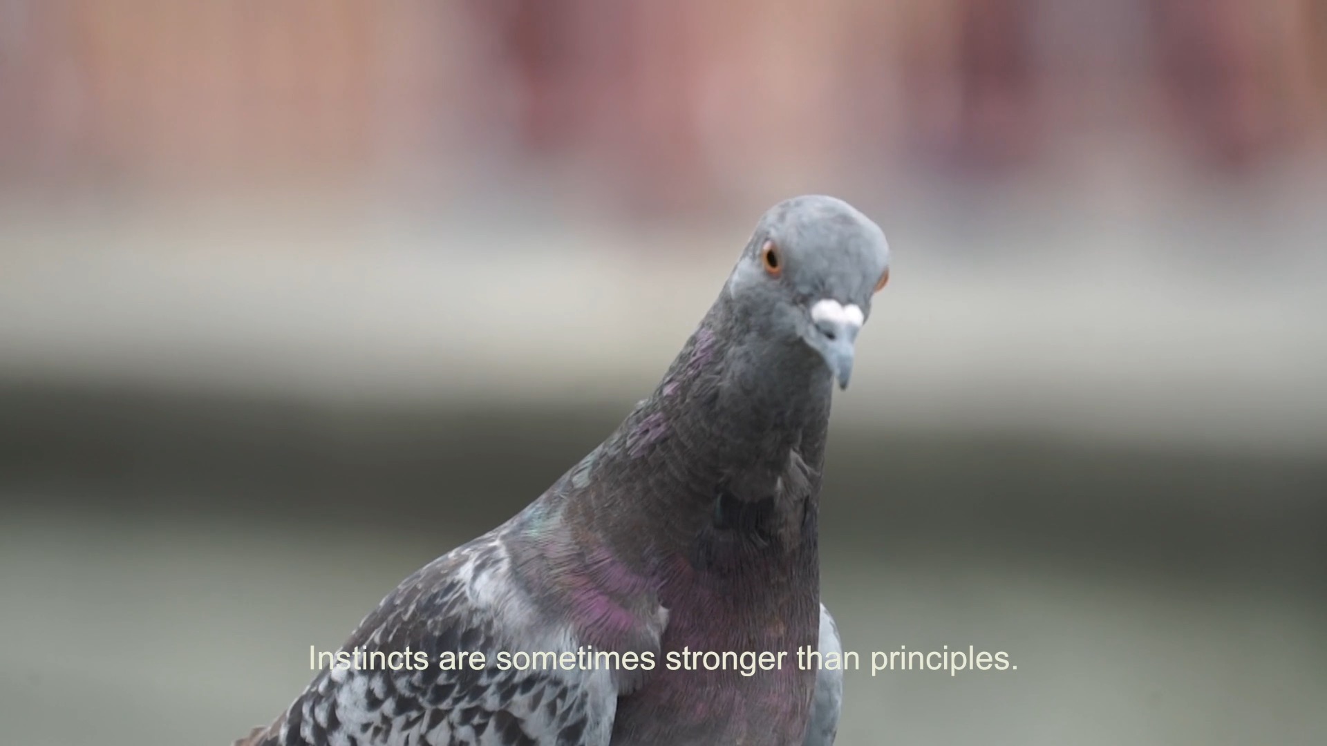 Queen of the Hill is a video exploring rock pigeons in Berlin. Filmed close-up, the pigeons appear large, and their feathers and colors shine in detail. The work combines observation, real-time voice-over, and poetic reflections inspired by thinkers such as Bruno Latour and Donna Haraway, exploring the well-being of urban birds. It reflects on interspecies relationships and everyday coexistence, presenting each pigeon as a queen in its territory.